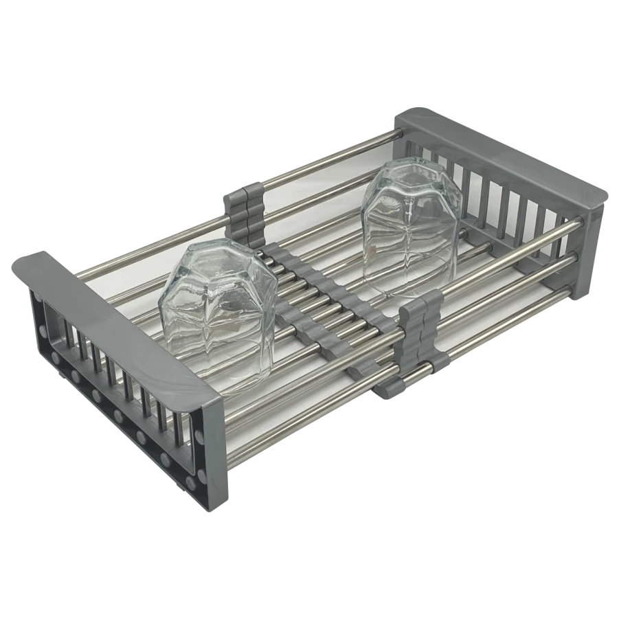 A practical and durable plastic sink basket for efficient dishwashing and storage.